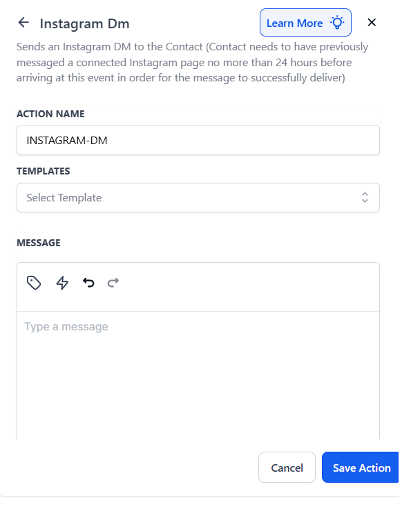 When setting up the Instagram DM action, you can choose to use a previously created template. This option is available in the Action setup menu and allows you to apply a pre-designed message format for your direct messages.