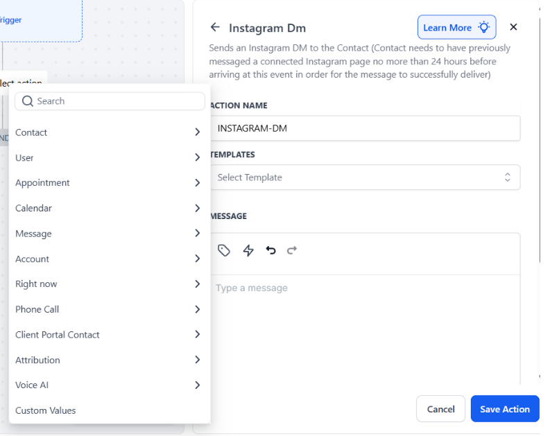 - Under Actions, select Instagram DM in the External Communications section of the Actions Menu or use the search feature. Upon selection, the Action setup menu will appear