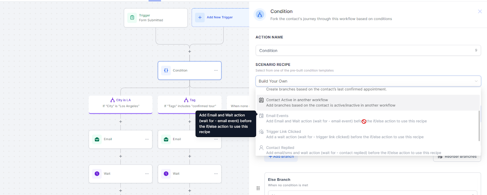 - Take advantage of the pre-built Scenario Recipes to speed up the setup of your If/Else conditions. These recipes help you quickly build logic without starting from scratch and ensure you consider all necessary prerequisites.