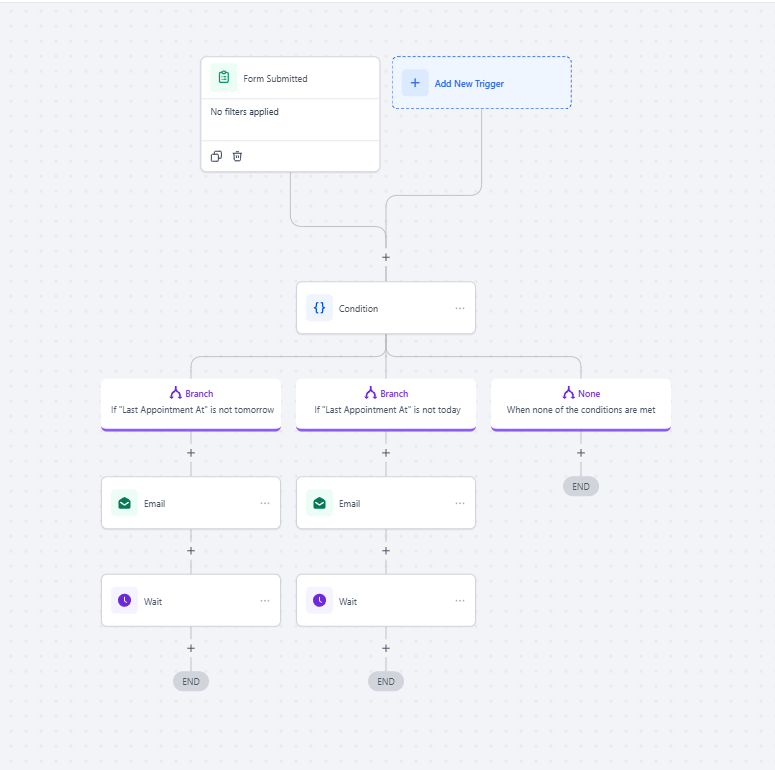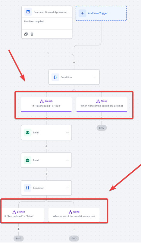 - Organize workflow branches based on conditions, such as whether an appointment was rescheduled.