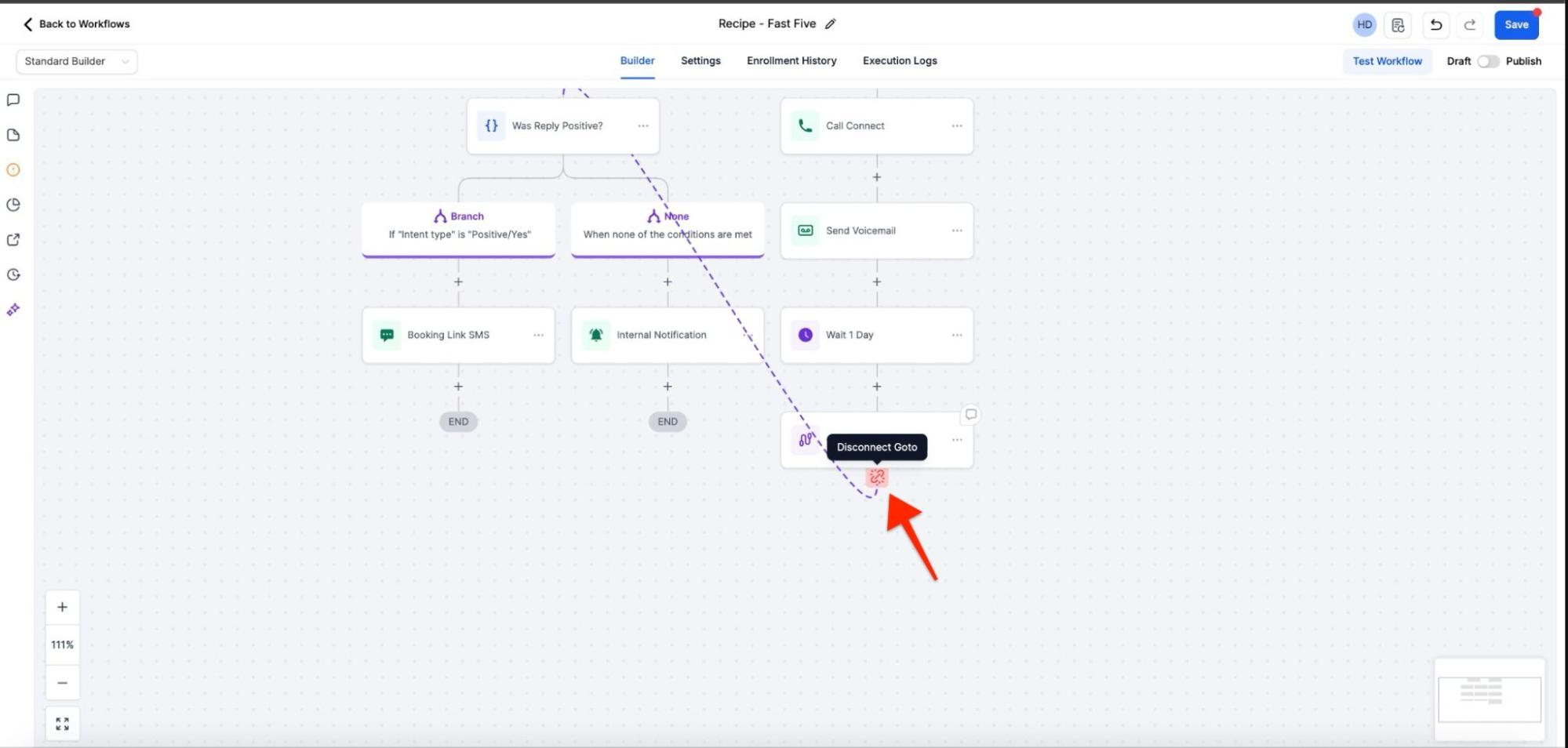 Answer: If you need to modify the action that was previously selected, simply click on the "Disconnect GoTo" icon beneath the Go To action. This will allow you to select a different action for the contact to follow.