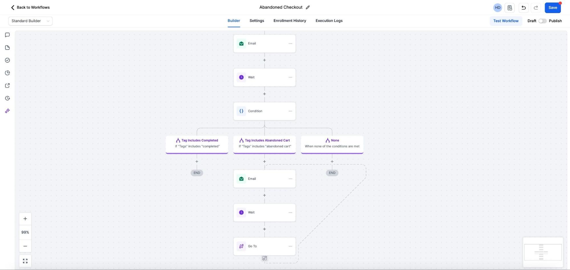 The “Go To” action in workflows is a powerful tool that allows you to redirect a contact to a different point within a workflow. This feature is particularly useful for managing complex workflows where you need to dynamically direct contacts based on their interactions or other criteria. Follow the steps below to effectively implement and use the “Go To” action in your workflows.