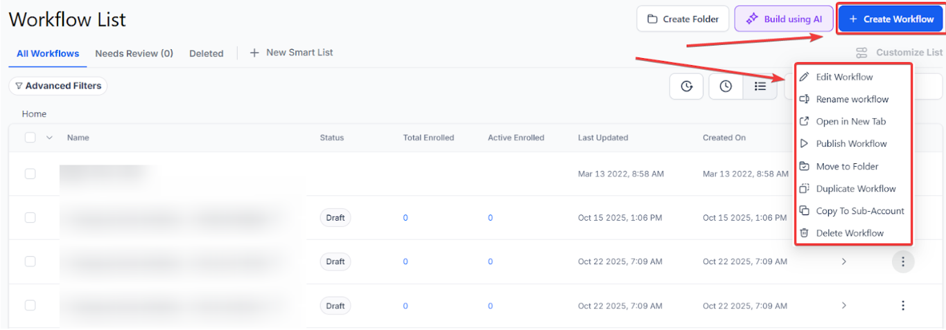 - Navigate to Tools & Reporting > Automations on the left > Workflows on the top and create a new workflow or edit an existing one