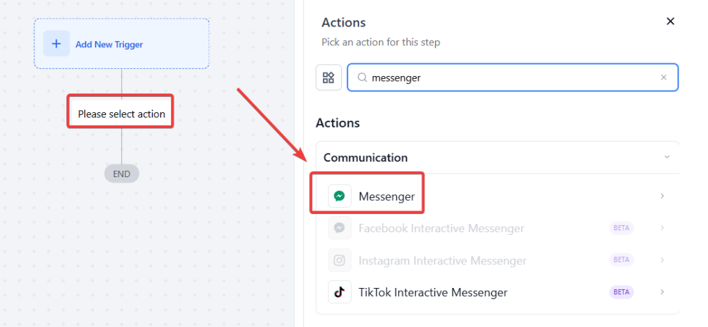 - Under Actions, select Messenger in the External Communications section of the Actions Menu or use the search feature. Upon selection, the Action setup menu will appear