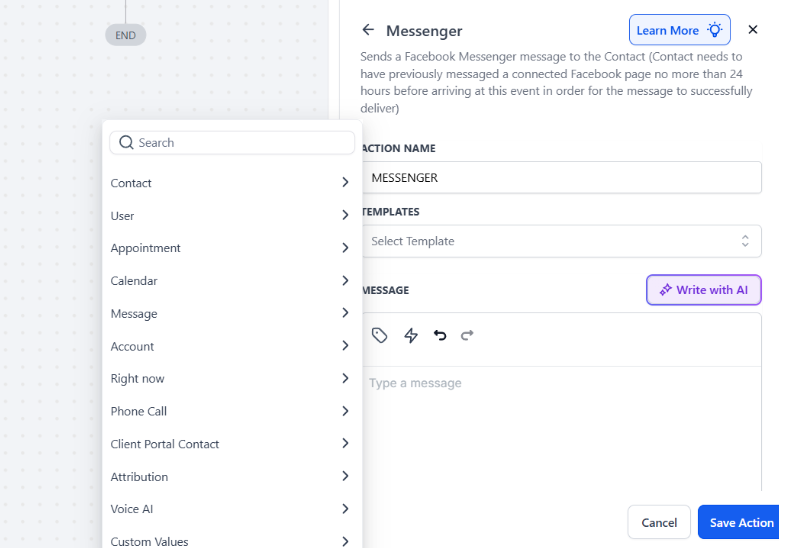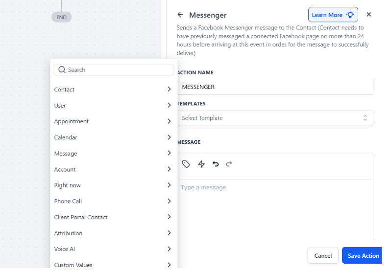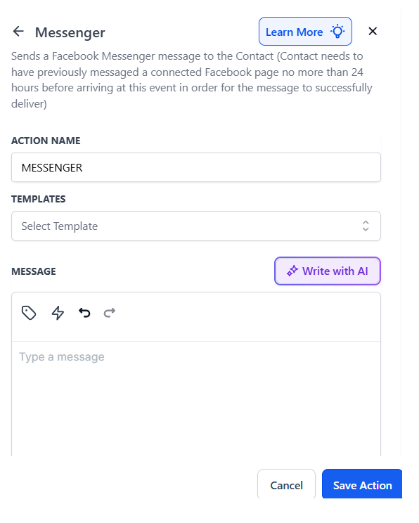 The Messenger Workflow Action allows you to send messages via Facebook Messenger to your contacts directly from within your workflow. It helps automate communication through Messenger, which is useful for engaging with leads, sending updates, or following up on inquiries.
