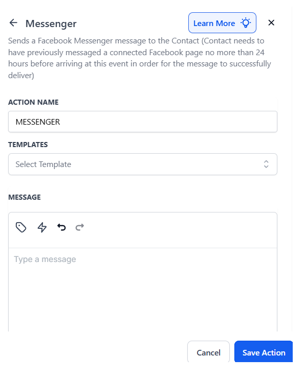 You must have a Facebook business profile integrated with your account to use the Messenger Workflow Action. Make sure the integration is complete before setting up this action.