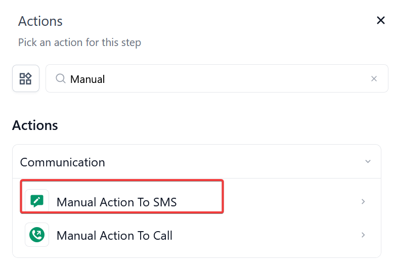 - From the list of available actions found in Communication, select "Manual Action to SMS", also known as Manual SMS.