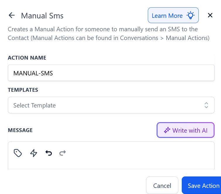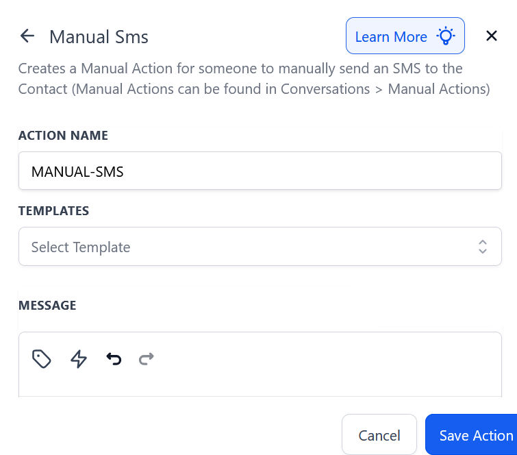 The Manual SMS Action allows you to create a task for a user to manually send a personalized SMS to a contact. This task is assigned within the workflow and is accessible in the Conversations > Manual Actions section.