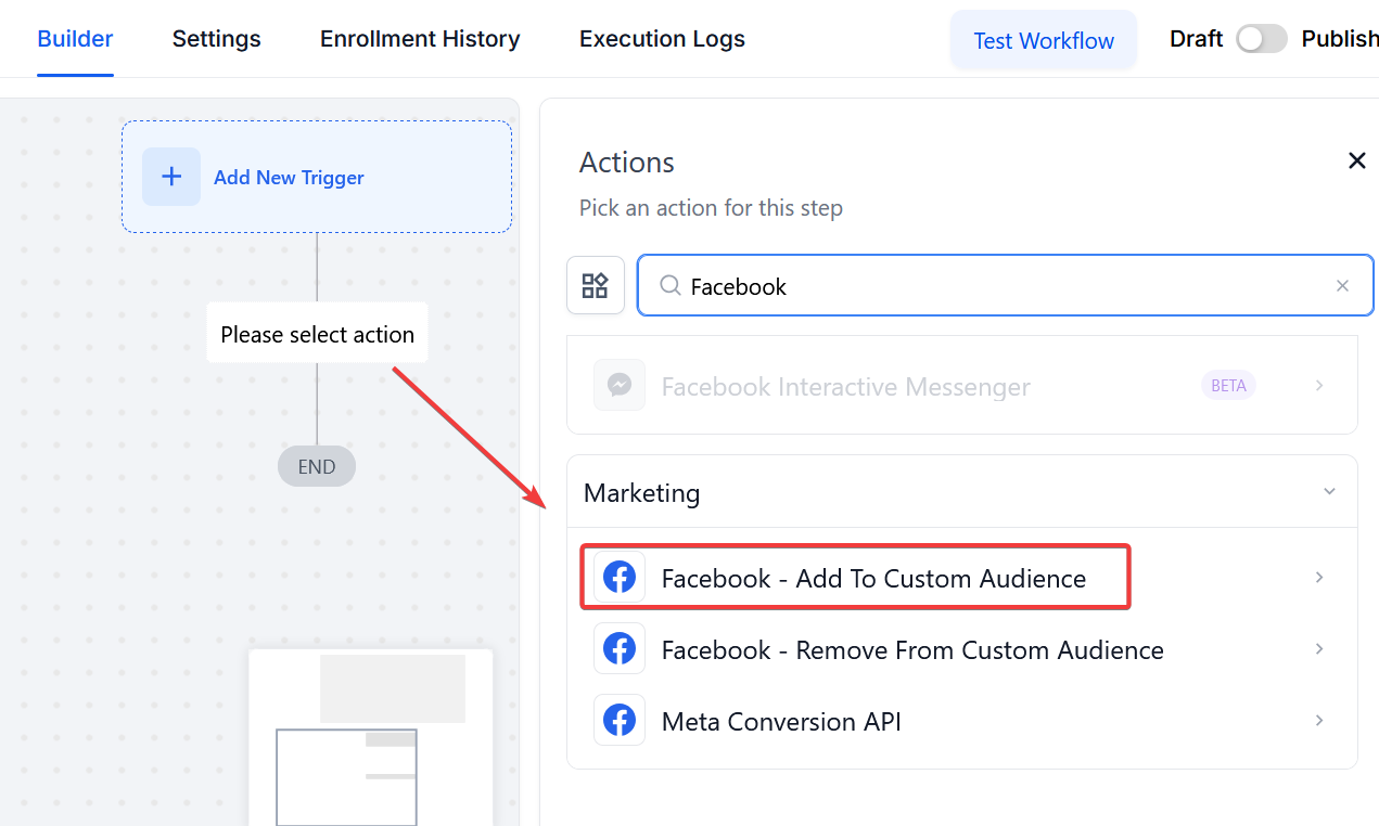 - Under Actions, select Facebook - Add To Custom Audience in the Actions section, or use the search feature. Upon selection, the Action setup menu will appear