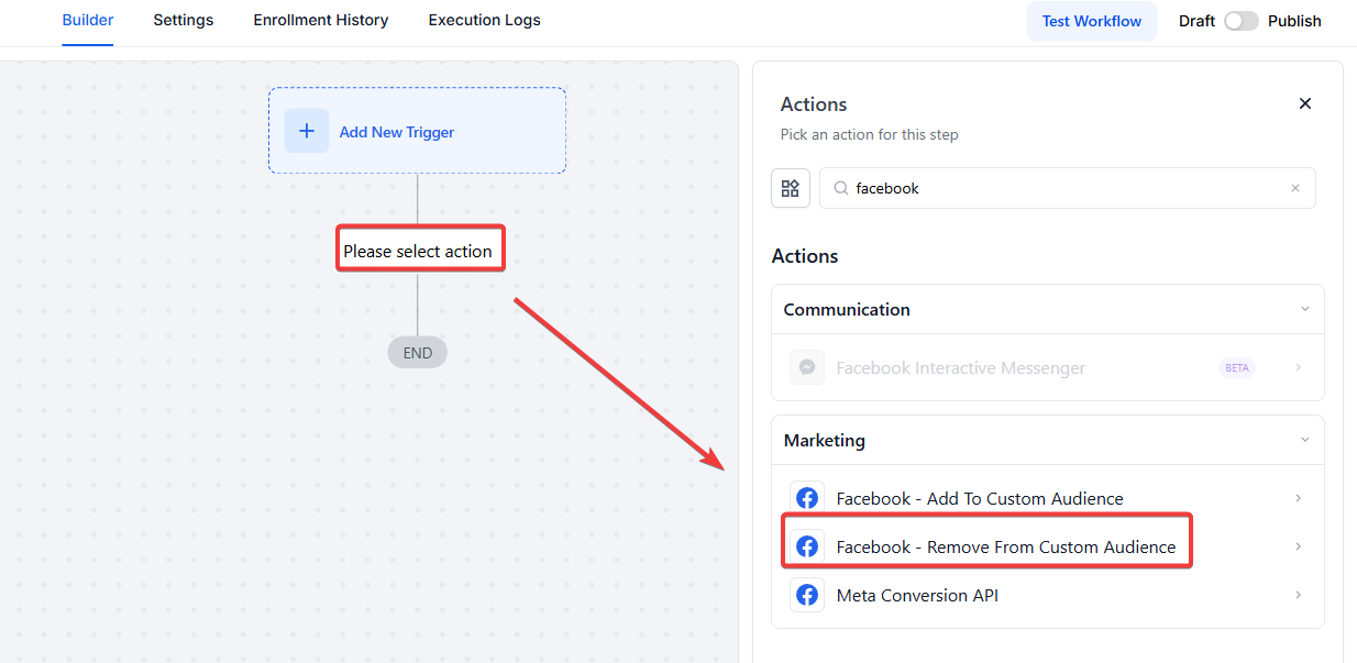 This action removes a contact from a specified Facebook Custom Audience automatically when the contact enters the workflow.