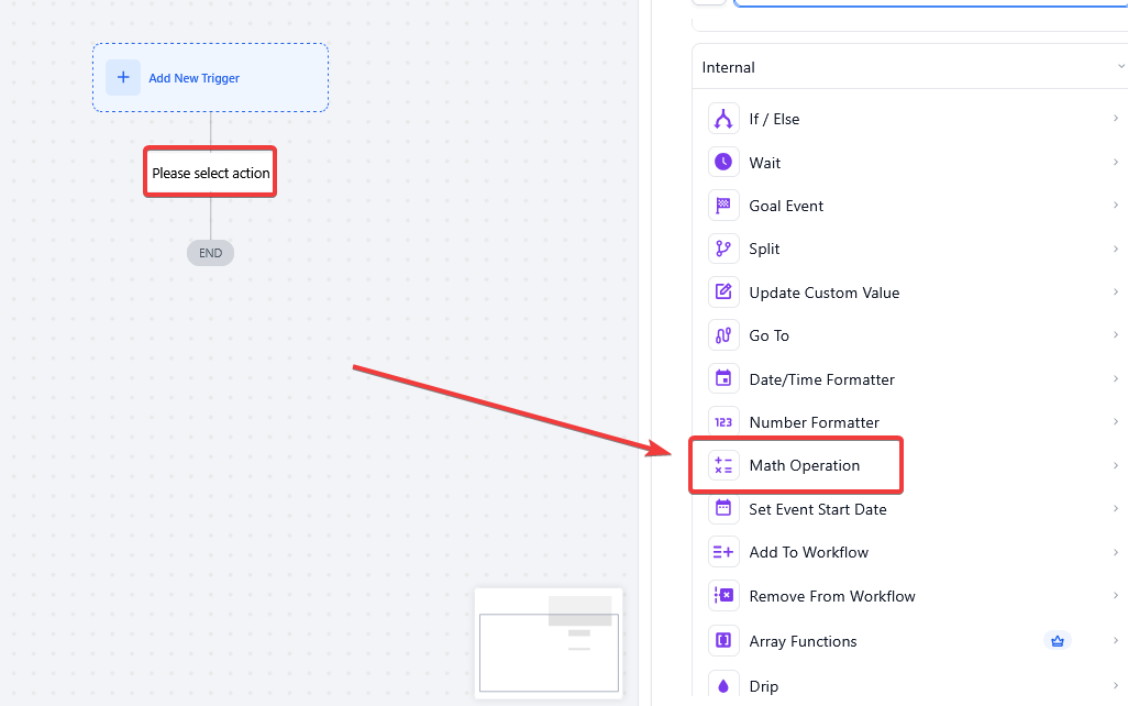 - In the workflow builder, click on the + icon to add Action and select "Math Operation" from the available options.