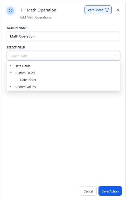 Users can update custom values directly within the Math Operation action, including Standard Fields and Custom Fields. They can also perform operations on custom values and adjust them in real-time, further improving workflow automation.