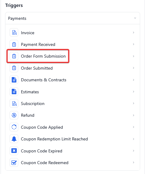 - Select Order Form Submission in the Payments section of the Workflow Triggers Menu or use the search feature. Once selected, the Trigger setup menu will appear