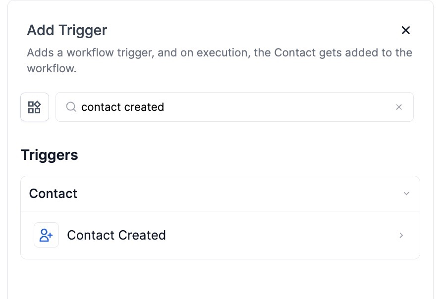 - Select Contact Created in the Contact section of the Workflow Triggers Menu or use the search feature. This will open the Contact Created Trigger setup menu.