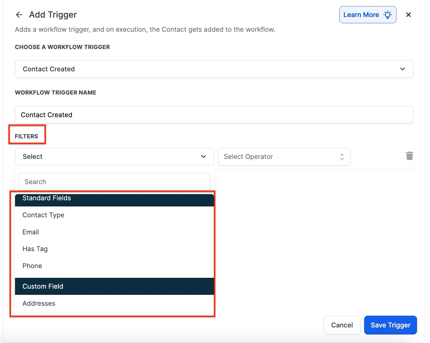 - Created via Source: This filter allows you to distinguish contacts based on their method of entry into the system. You can define whether the workflow should activate only for contacts manually added, submitted through a form, or imported via API. This ensures that automation is not triggered for contacts that don't need immediate attention, such as those from bulk imports.