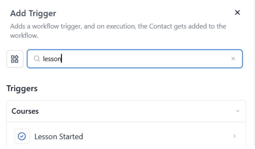 - Add the Lesson Started Trigger: Select the Lesson Started trigger from the list of available triggers in the Courses category. This will enable the workflow to activate whenever a member begins a specific lesson within your course.