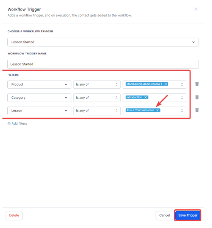 - Customization with Filters: Customize your workflows by adding filters to target specific lessons or categories, ensuring the trigger activates only when users interact with particular parts of your content.