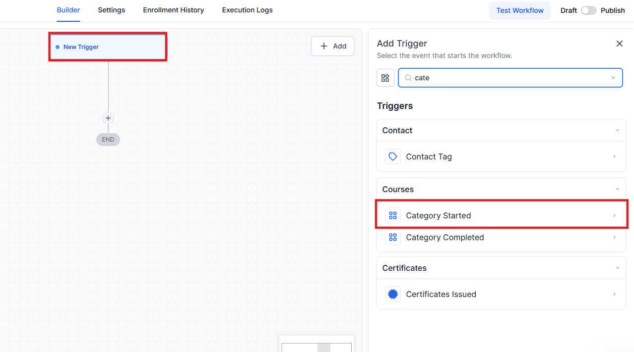 NOTE: If you don’t select filters, this will run for any category completed. If you filter more specifically, you can choose to have the Workflow run when a specific product’s course and category are completed.