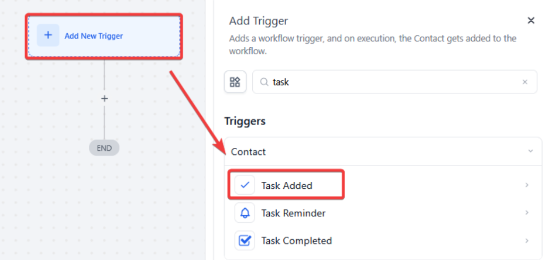 - Select the “Task Added” button in the Contact section of the Workflow Triggers Menu or use the search feature. Once selected, the Trigger setup menu will appear.