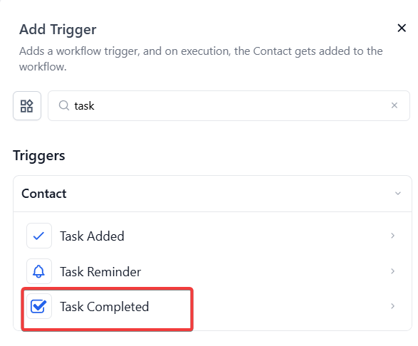 Select Trigger Type: Choose Task Completed Trigger from the list of available triggers.