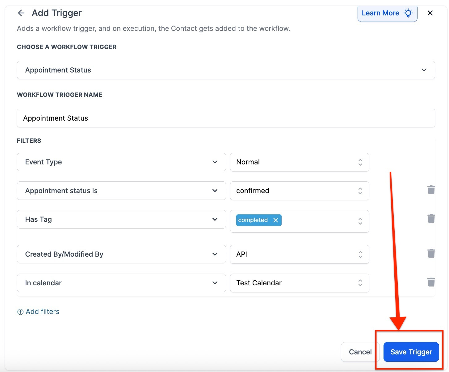 - Under Filters, specify appointment types and statuses that will trigger the workflow.