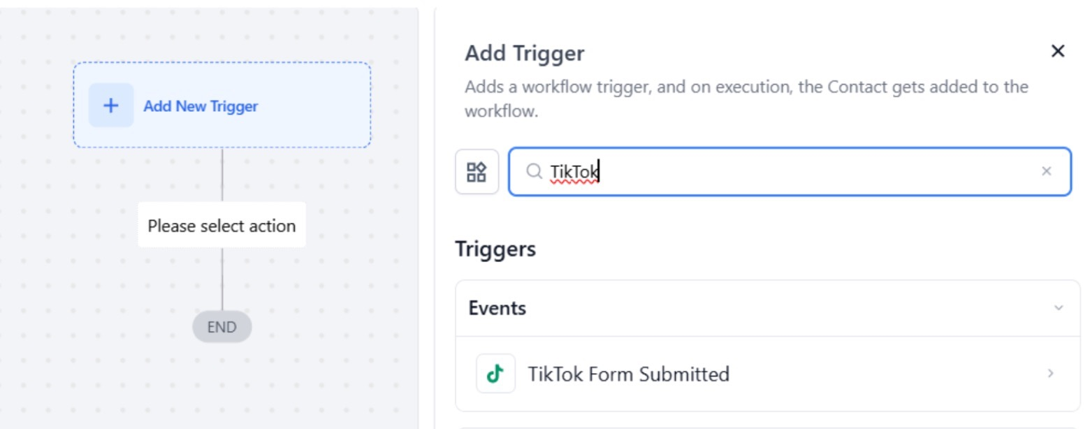 The TikTok Form Submitted Workflow Trigger activates a workflow whenever a contact submits a TikTok Lead Form. This allows you to automate follow-up responses and effectively manage new leads from TikTok.