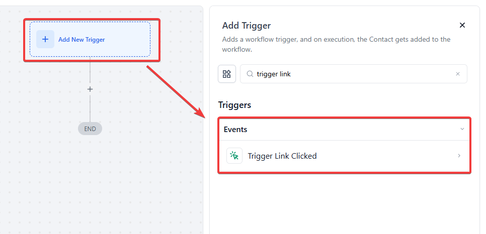 - Begin by starting a new workflow or editing an existing one in the Workflow builder. Click “Add New Workflow Trigger” and select “Trigger Link Clicked” from the Contact Actions section of the Workflow Triggers Menu.