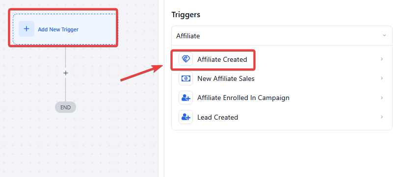 - Select Affiliate Created in the Affiliate section of the Workflow Triggers Menu or use the search feature.