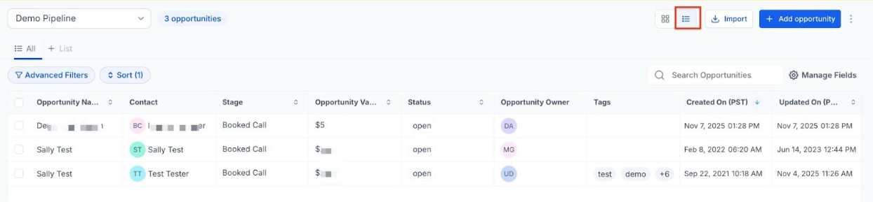 - Sort opportunities by various fields such as name, value, or date created.