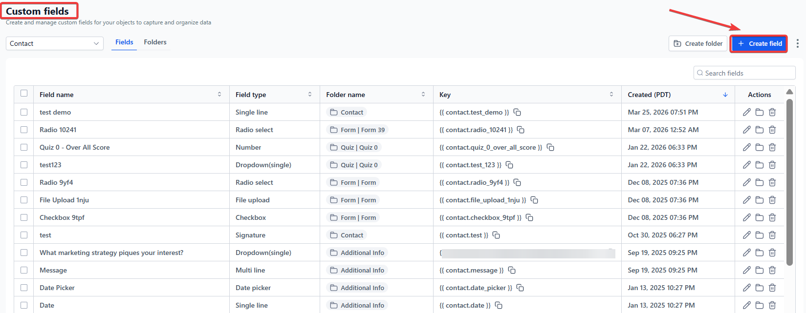 - In the custom fields area, you have the flexibility to create new custom fields or edit existing ones.