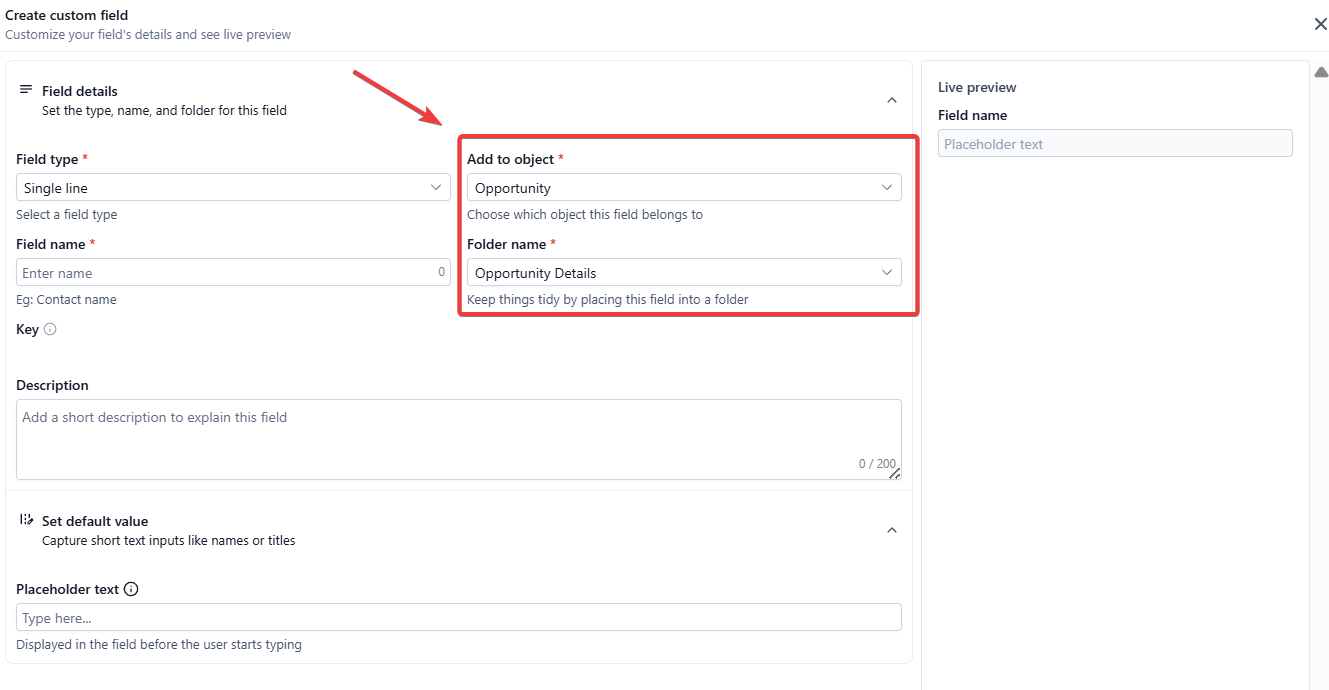 - Once you have selected the custom field type that you prefer and click on next ensure to select the object as Opportunity and for the group you can select the default or a custom group you create(Please see next section). This will populate the field into all opportunity cards.