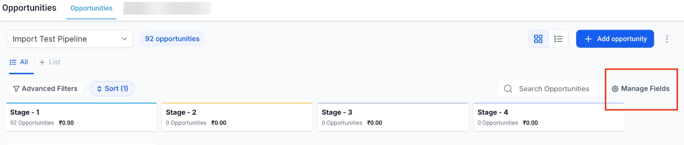 - In the opportunity card, find the "Add/Manage Fields" option to access the custom fields area.