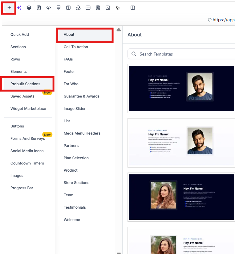 - Pre-Built Section Templates: Easily add ready-made sections like welcome, about, team, and testimonials to your project by navigating to the funnel builder, clicking the plus icon for Add Elements, and selecting from the pre-built sections.