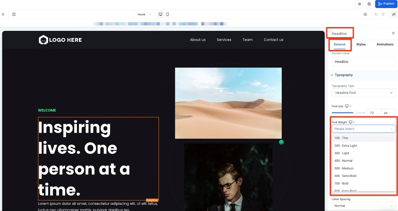 Answer: Navigate to the font-weight settings within the builder and choose from options like light, medium, or bold. Ensure any pre-marked bold text is deselected to apply the desired changes. Availability of font weights may vary depending on the font family.