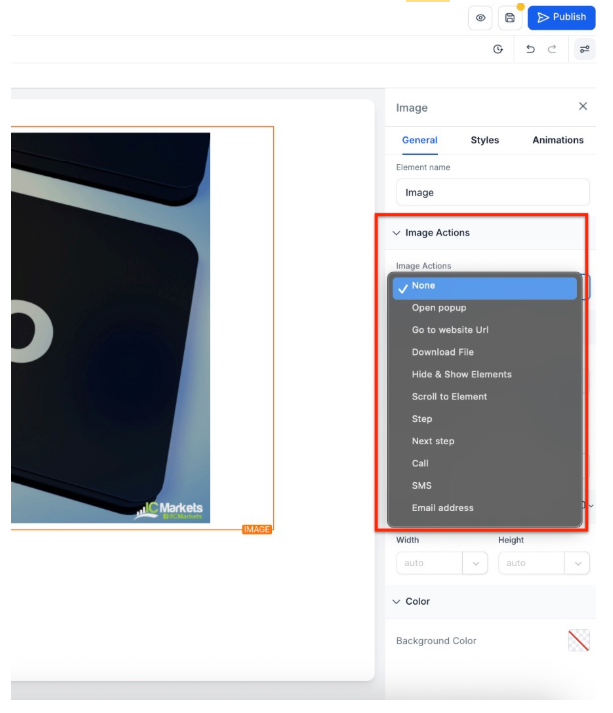 Simply click on an image within your funnel or website, and the image action options will appear in the image settings panel. These allow you to interact with your images in dynamic way