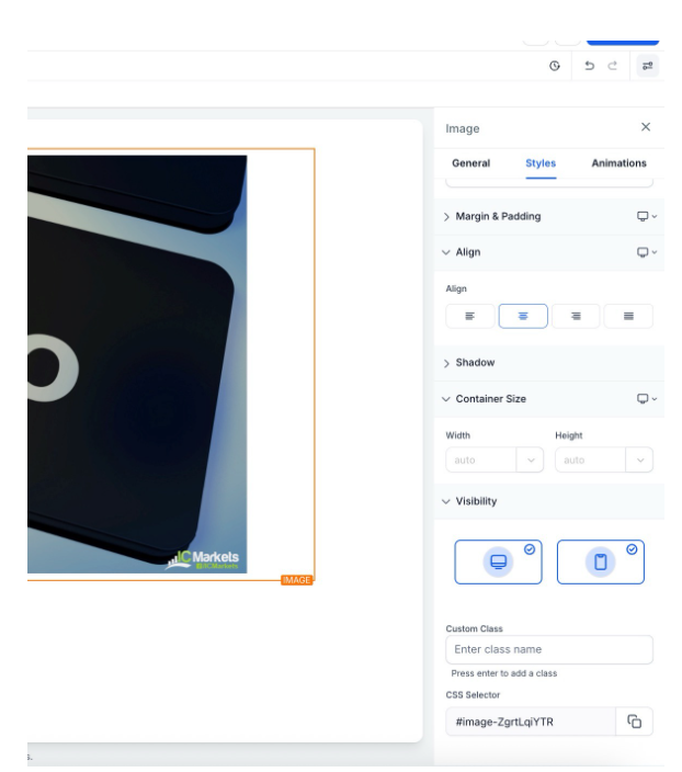 - Styles Settings: Here you can edit, shadow, visibility, and custom class