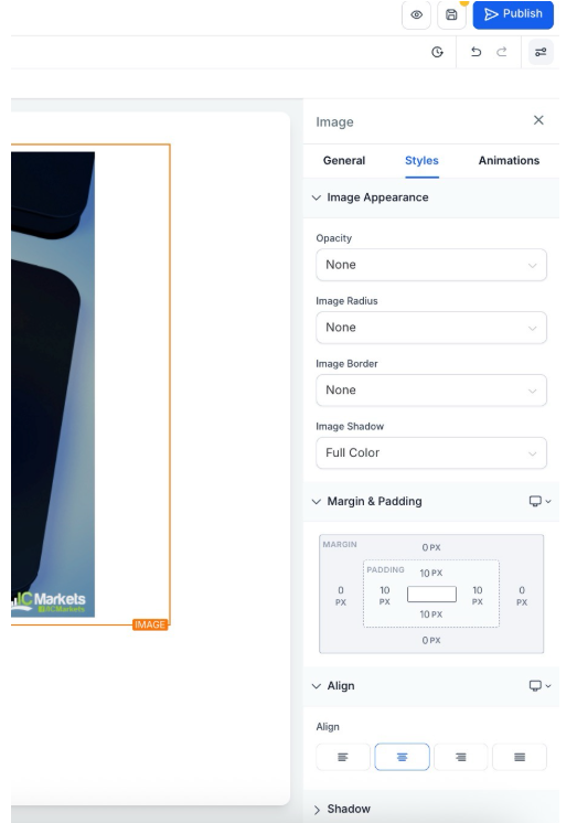 - Styles Settings: You can set opacity, alignment, and edit margins and paddings in the Styles Settings.