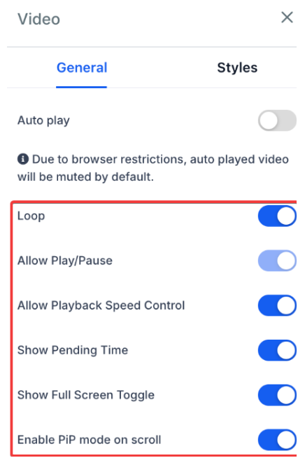 - Yes, for Hosted Videos, you can enable or disable user controls such as Play/Pause, Playback Speed Control, Showing Pending Time, Full Screen Toggle, Progress Bar, and Seeking options within the General Video Settings.
