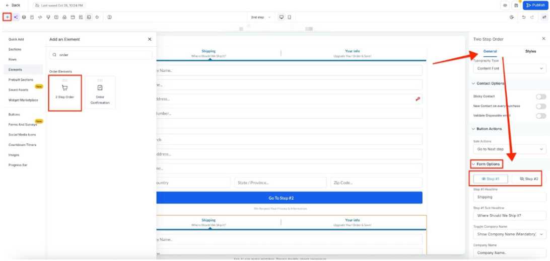 - Select Add Element and on the right side menu, scroll to the Order Elements