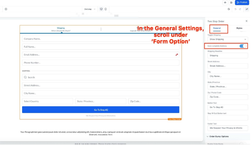 You can customize the form’s title, and button styles, and enable/disable options like order bumps, coupon codes, or sticky contacts.