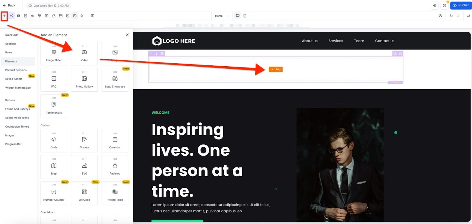 Select the section where you wish to add your video.