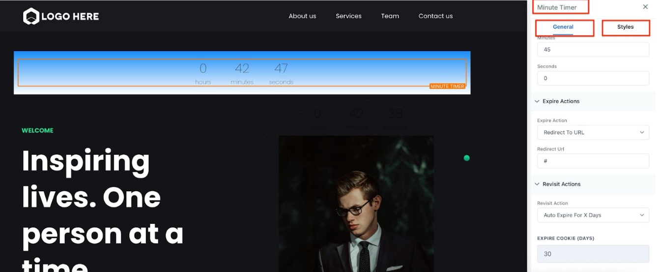 - In the top left menu, select Elements > Add Element > Countdown. From the three options within Countdown, choose "Minute Timer". This will appear in the top center of the page.
