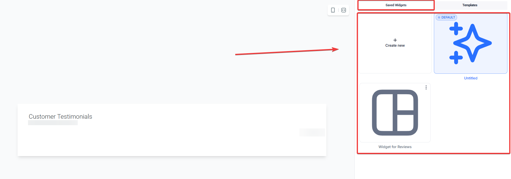 - On the right side, you will see a panel that will allow you to create a new widget or select one from the templates.