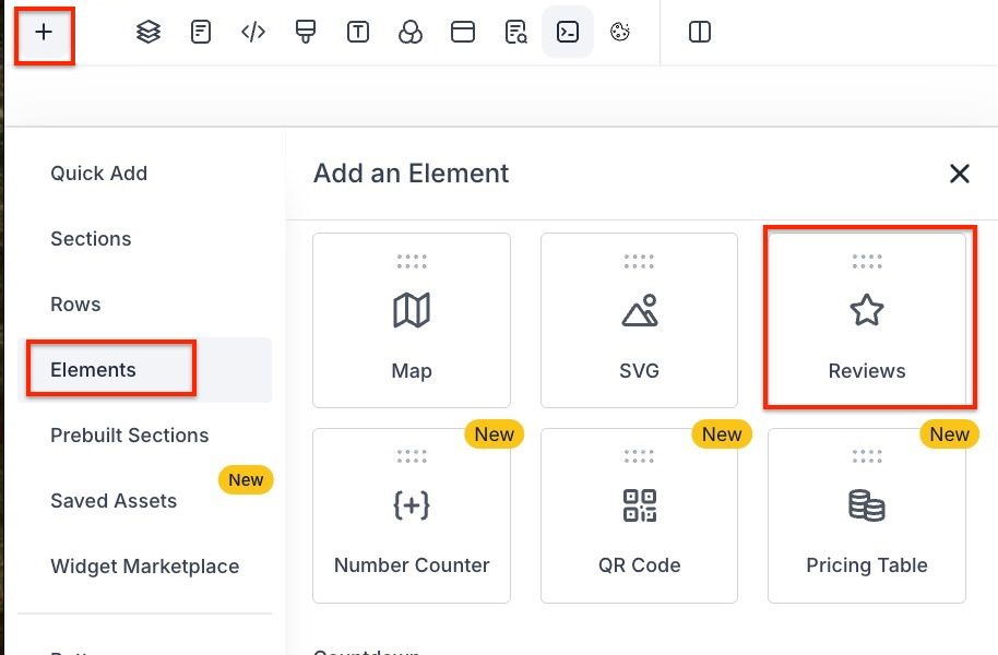 - Scroll down to the Custom elements, click, drag and drop the Review element