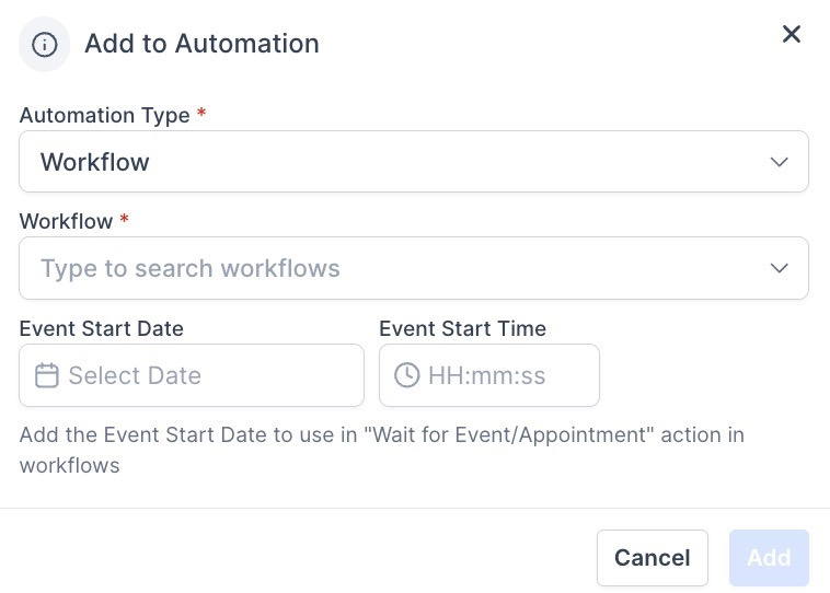 - Click the “Add Workflow” button, choose the workflow you want to test, leave the “event date” blank, and then click the “Add” button.