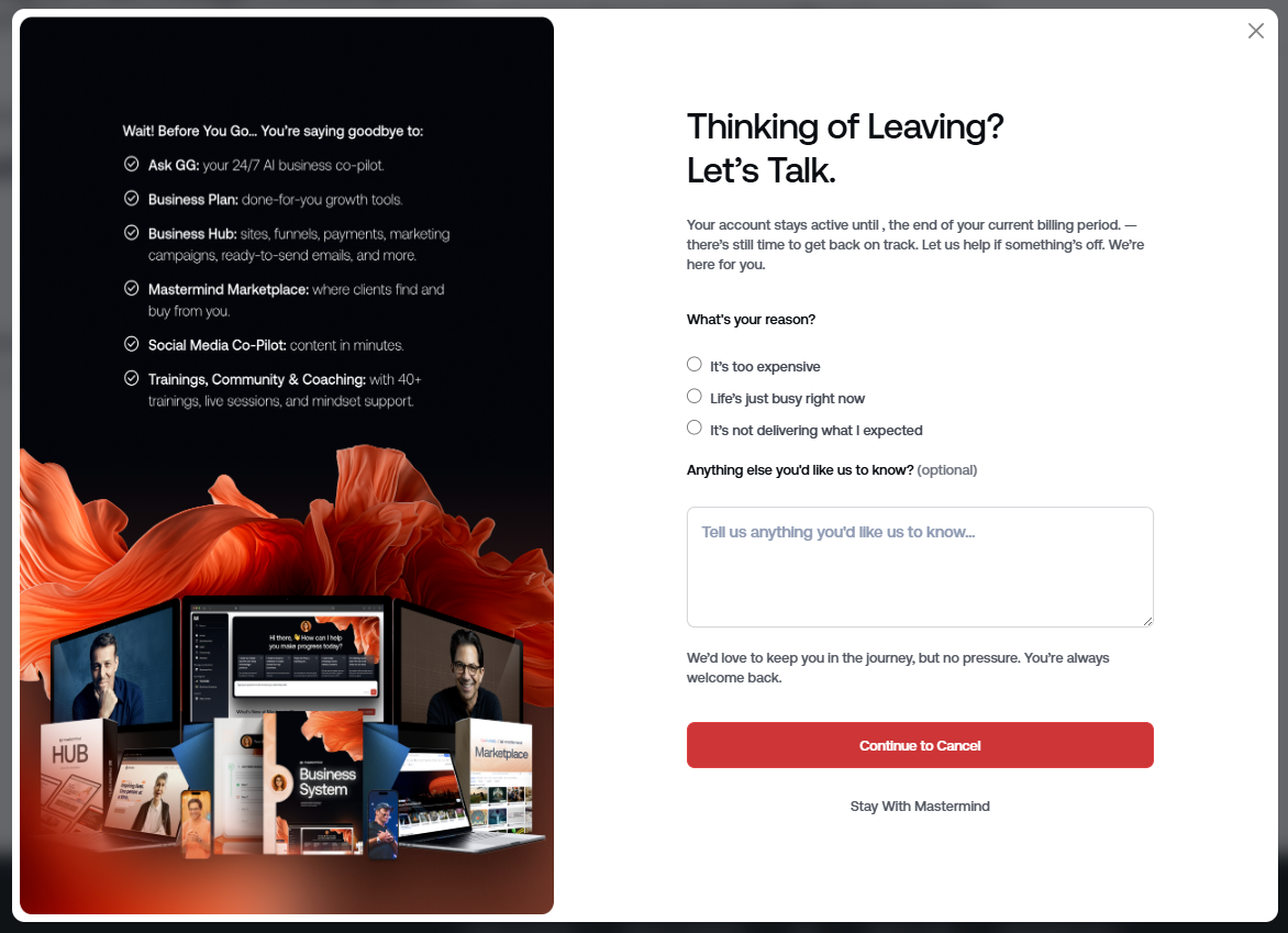 If you’re considering canceling your Mastermind.com membership, we’d love to hear from you. Please reach out to our Support team at support@mastermind.com. We’d appreciate the opportunity to understand your needs and explore how we can continue supporting you as part of the Mastermind family. You can also make updates to your membership via the “Manage Subscriptions” section within Mastermind.com.