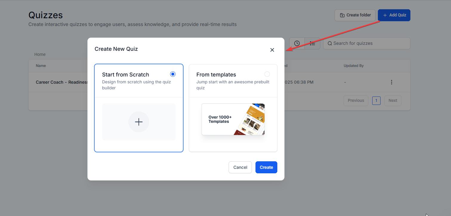 - Click Add Quiz and choose to create from scratch or from pre-built Templates.