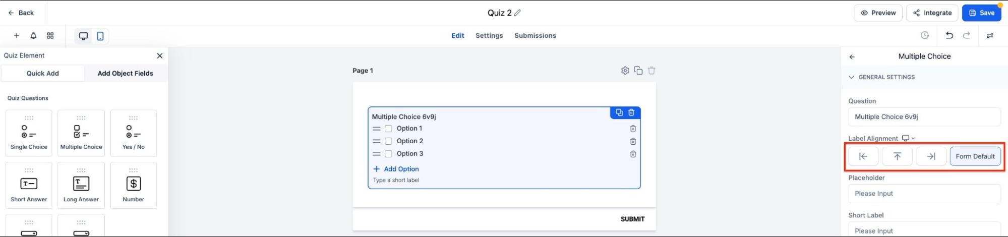 Element-Level Label Alignment allows users to set label positioning in quizzes, providing more precise layout control. To apply, select a field within a Single Column layout, choose the desired label alignment—Left, Right, Top, or Form Default and save the changes.