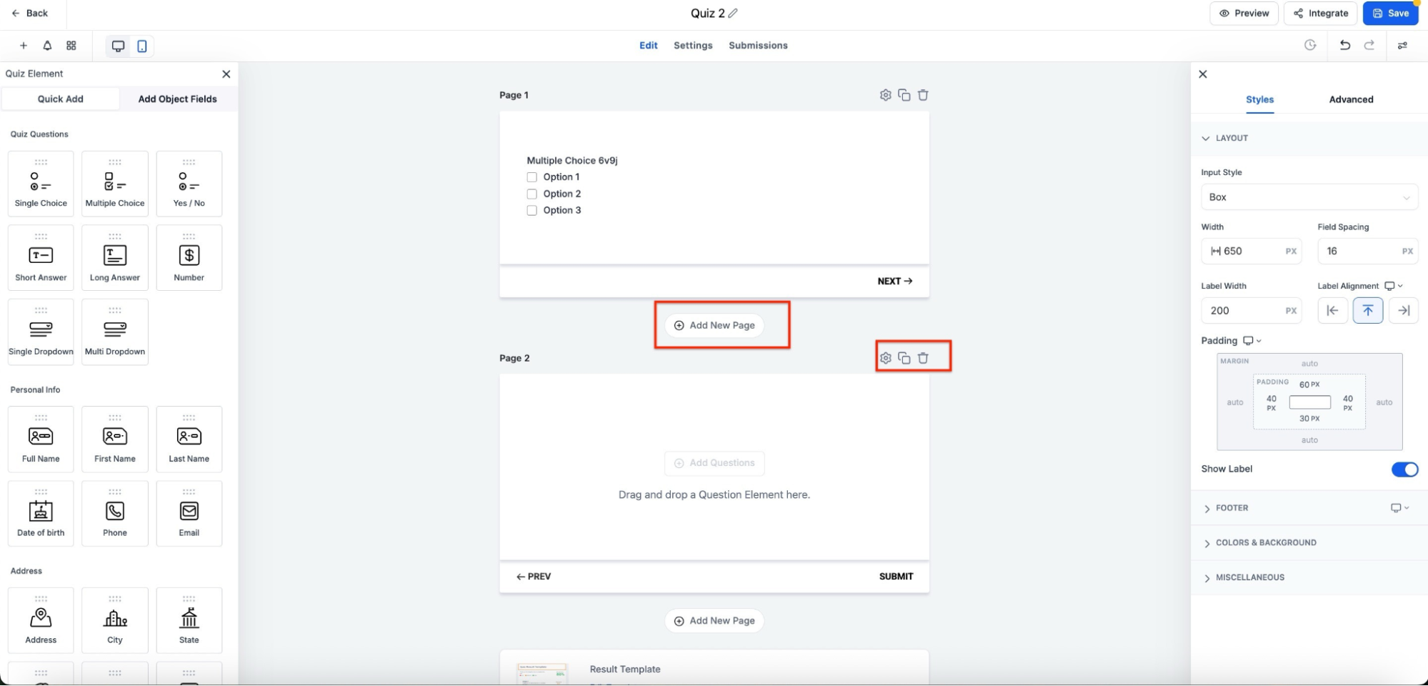 You can add additional pages within the quiz builder. You can then modify it settings: the name of the page and its positioning. You can also clone the page or delete the additional page.