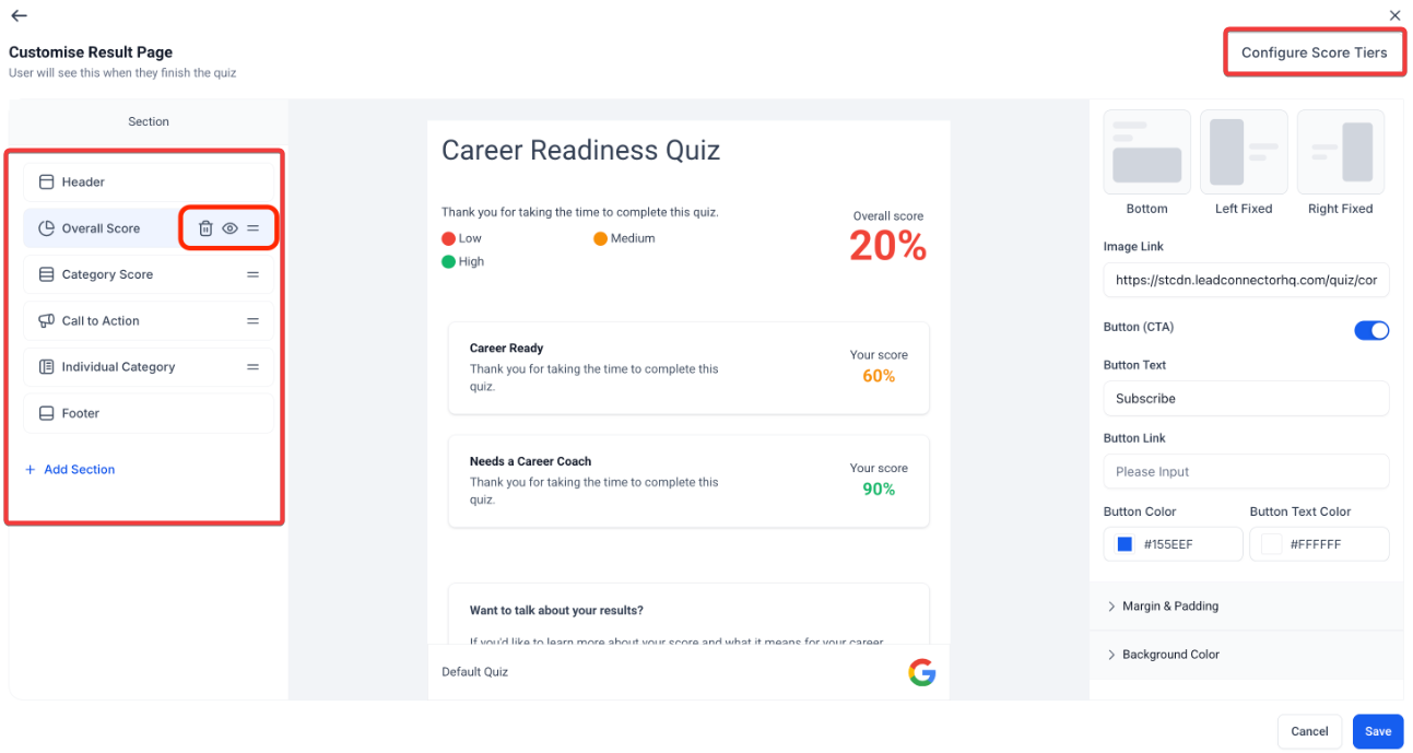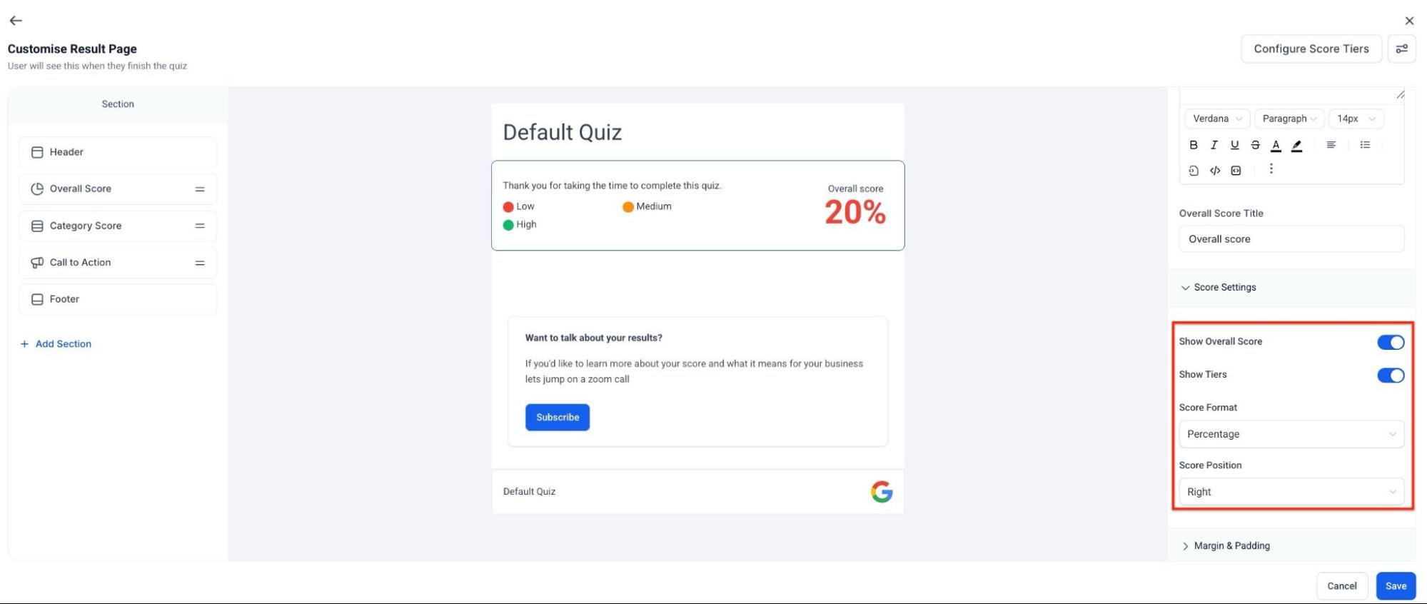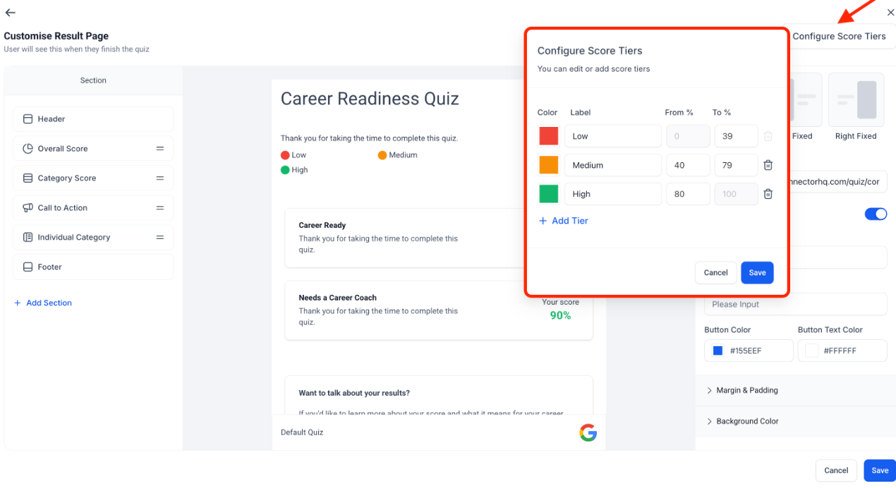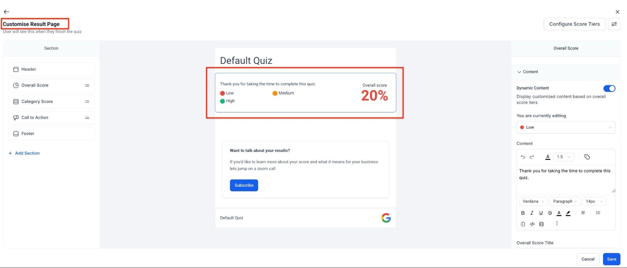 - Use the Edit Template option on the result page to set up score-based tiers (e.g., low, medium, high). Each tier can display different colors, messages, and calls to action.